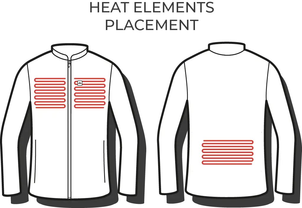 Verwarmingspanelen zijn strategisch geplaatst op de borst en rug en worden bediend met één knop op de borst. Hierdoor heb je snel toegang tot warmte en kun je de temperatuur eenvoudig aanpassen aan het weer, je activiteit en je persoonlijke behoeften.